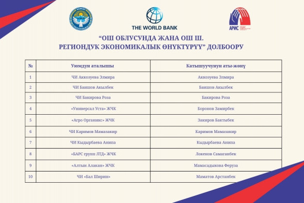 В рамках проекта «Региональное экономическое развитие в Ошской области» (г. Ош) мы рады представить список участников, прошедших на следующий этап. Ознакомьтесь со списком в карусели