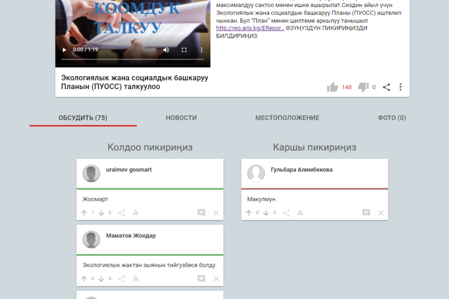 В общественных слушаниях приняло участие 17 433 уникальных пользователя, работа проводилась на онлайн-платформе АРИС, где созданы порталы для каждого села. Такая инновационная форма работы используется с начала реализации проекта, с учетом недопущения распространения COVID-19, для того, чтобы вовлечь максимально большее количество бенефициаров.